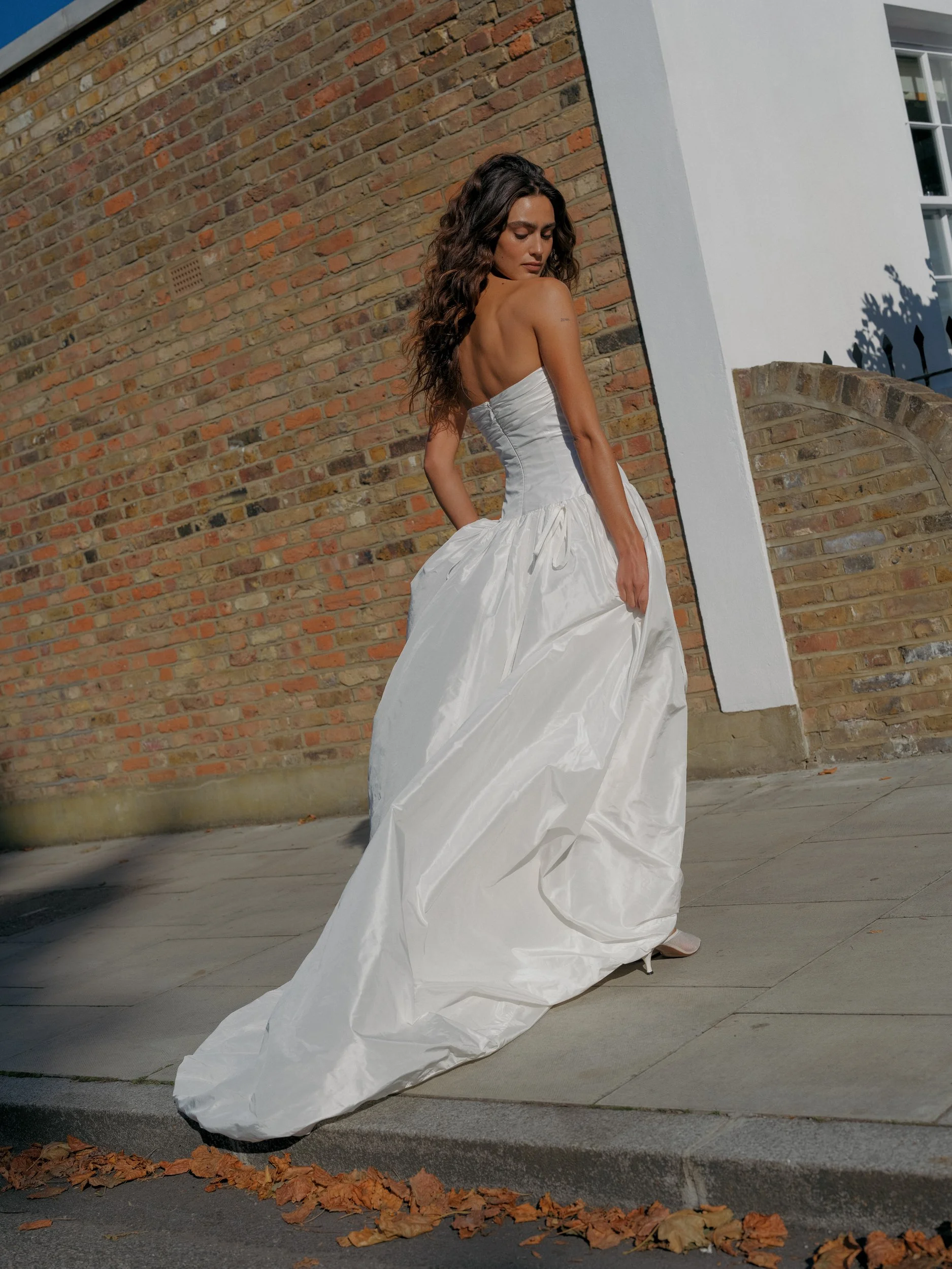 With Willa, you have four dresses in one. Crafted entirely in silk taffeta, the gown has ties on the inside and outside which allow you to hook the skirt up in whichever way feels right; one side split, two at the front or all four to take the whole dress off the ground (great for dancing!).
