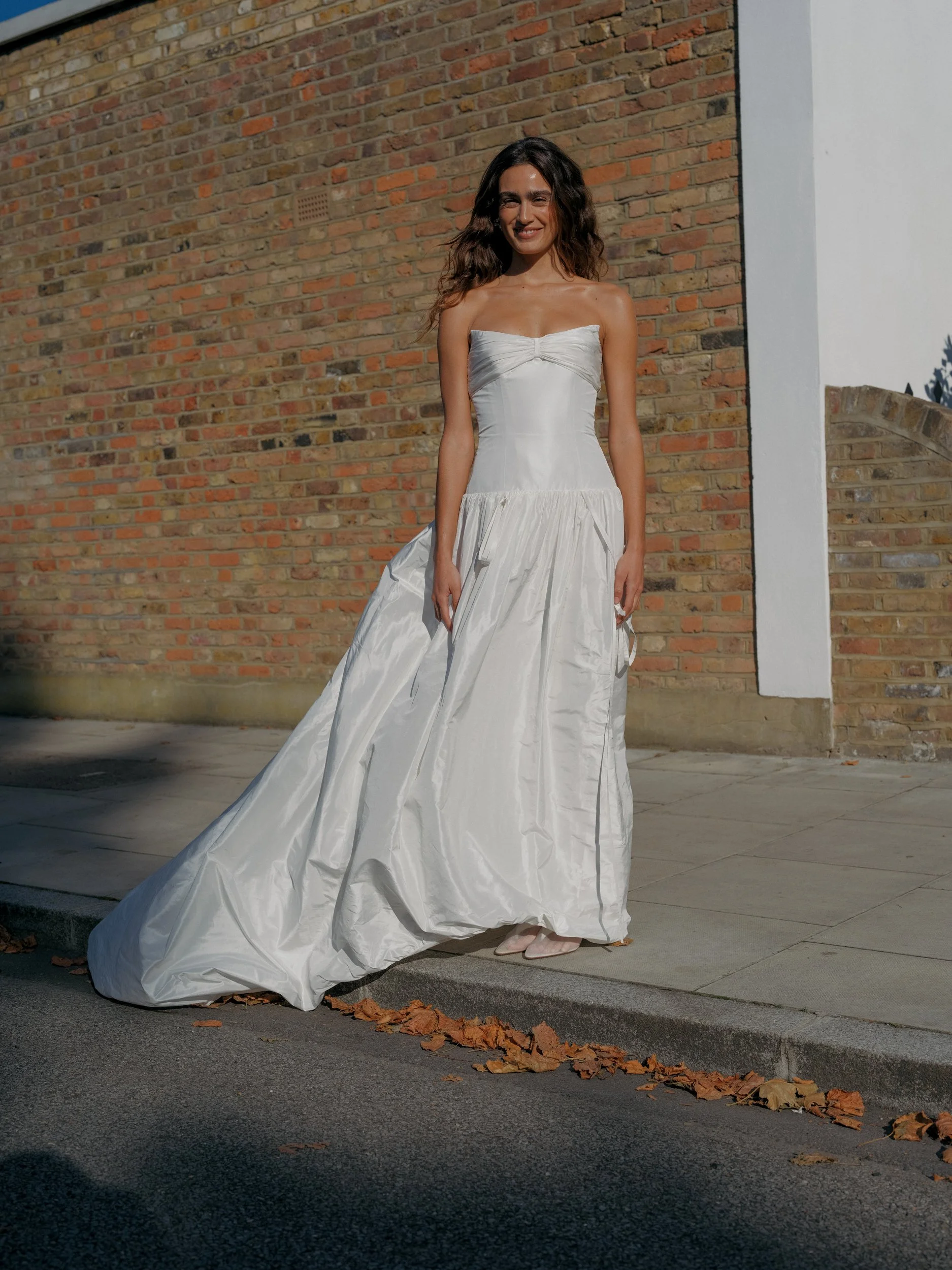 Willa features gathering over the bust, a flattering structured bodice with dropped waist, a bubble hem and good sized train.